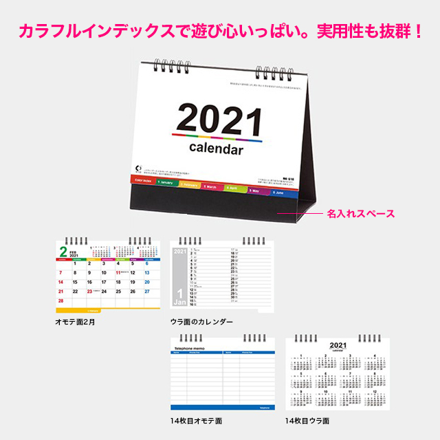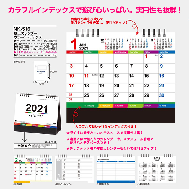 カラフルなインデックスで遊び心いっぱい 見やすい数字と広いメモスペースで実用性抜群! 裏面には六曜入りのカレンダーや便利なメモスペース付き テレフォンメモ・年間カレンダー付。