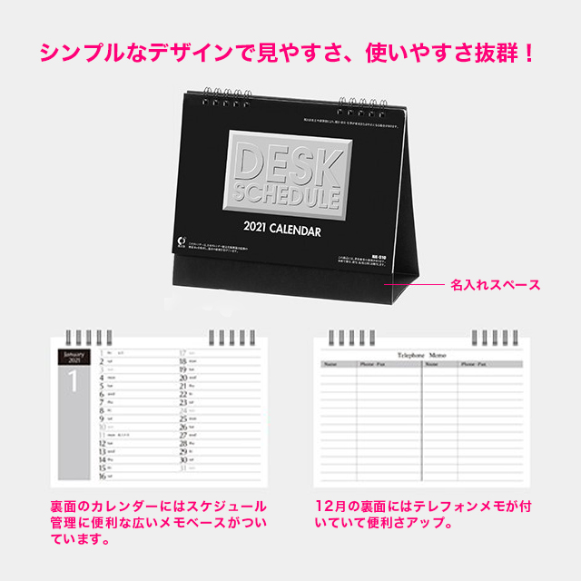 シンプルなデザインで見やすさ使いやすさ抜群! 裏面にはスケジュール管理に便利なメモスペース付き 12月の裏にはテレフォンメモ付。